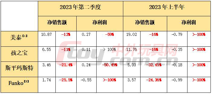 北美四大玩具巨頭無(wú)論是在今年第二季度還是上半年,凈銷(xiāo)售額都全線(xiàn)下跌。跌幅最小的是孩之寶,第二季度凈銷(xiāo)售額下跌11%,上半年下跌16%。而在凈利潤(rùn)方面,除了孩之寶在今年第二季度同比扭虧為盈之外,其他三家在今年第二季度均有不同程度的下跌,跌得最慘的是Funko,去年還有盈利,今年反虧0.55億美元。而從今年上半年來(lái)看,四家全部都是虧損,虧得最多的也是Funko,虧損額達(dá)到0.99億美元。