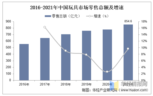 2016-2021年中國玩具市場零售總額及增速