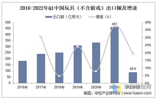 2016-2022年Q1中國玩具(不含游戲)出口額及增速