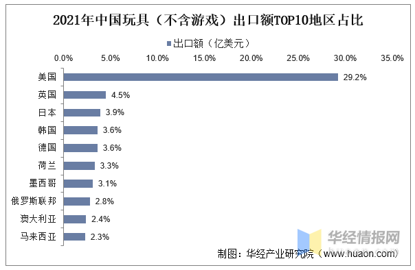 從出口目的地看,美國是第一大出口國,2021年我國玩具(不含游戲)出口到美國的金額占比達到2.92%,其次是英國、日本、韓國、德國、荷蘭、墨西哥、俄羅斯聯(lián)邦、澳大利亞、馬來西亞等地。