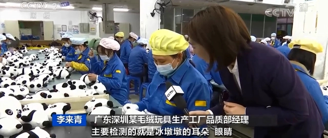 廣東深圳某毛絨玩具生產(chǎn)工廠品質(zhì)部經(jīng)理 李來青:主要檢測的就是冰墩墩的耳朵、眼睛、鼻子、嘴巴、手??匆幌掠袥]有爆口,后面縫口位,尾巴縫制得好不好,還有商標(biāo)??p制完、檢查完以后,就可以到下一個(gè)環(huán)節(jié),裝硅膠外殼。